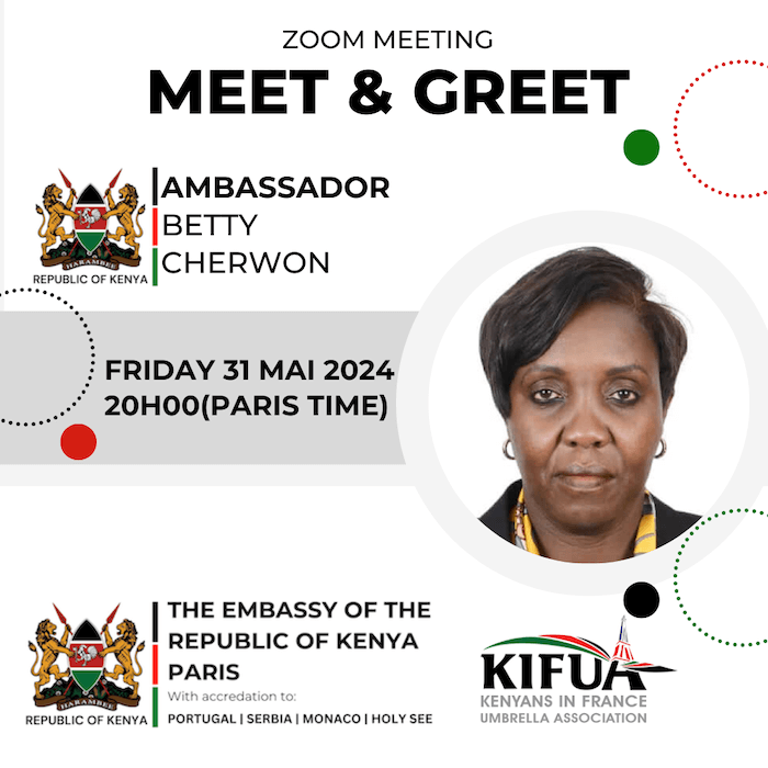 ZOOM MeetingAmbassador Betty Cherwon meets Kenyans in France. Join the Zoom on Friday 31 Mai 2024 Link to join the meeting https://us02web.zoom.us/j/84922152570?pwd=ug7RIobbuIluBJqAlMIqAkrjZlrNma.1 Password: KIFUA